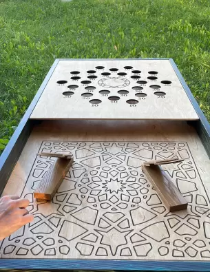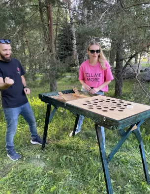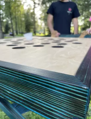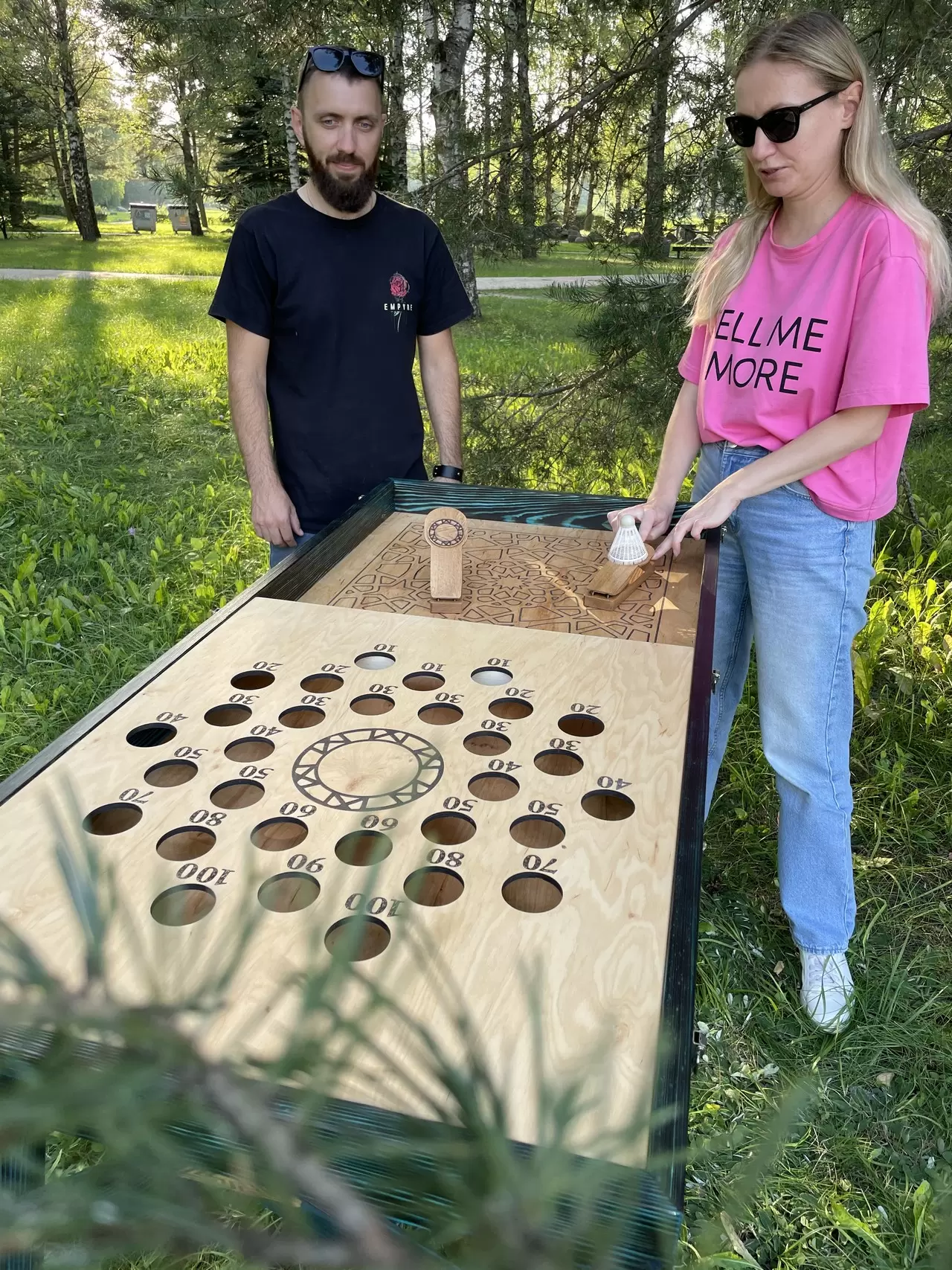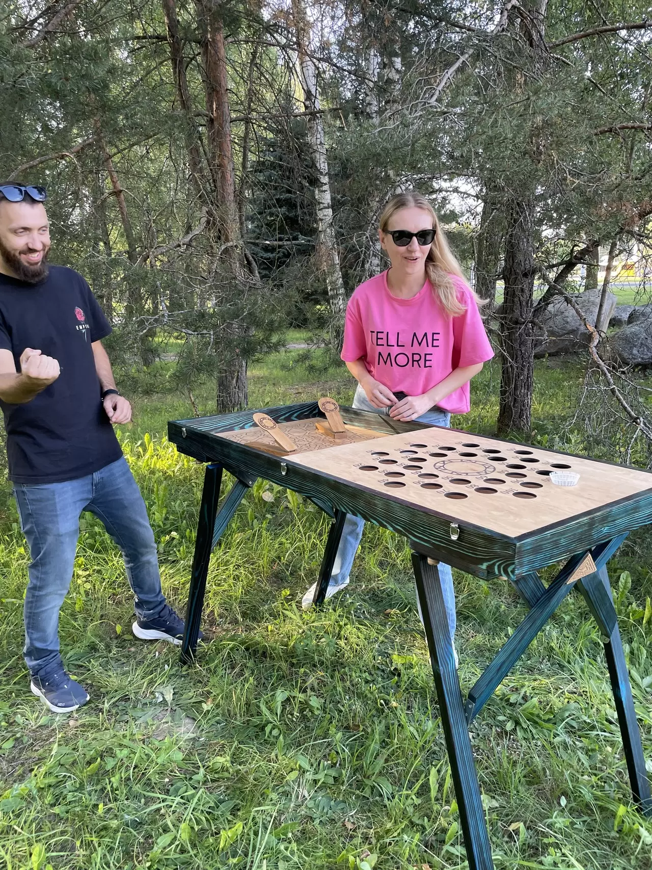 "Бадминтон" - это деревянная настольная игра, которая была вдохновлена классическим бадминтоном, но является адаптированной версией этой спортивной игры. В отличие от традиционного бадминтона, наша игра идеально подойдет для любых мероприятий и условий, будь то лето или зима, с ракетками или без.