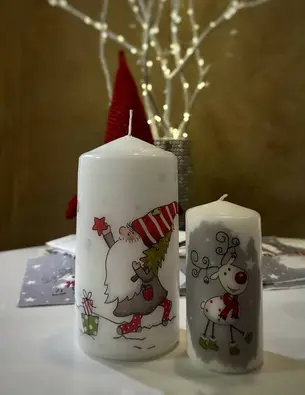 - наносят выбранный рисунок на свечу, добавляют декоративные детали (ленточки, блестки, бусины).